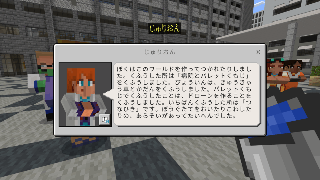 ぼくはこのワールドを作ってつかれたりしました。くふうした所は「病院とパレットくもじ」をくふうしました。びょういんは、きゅうきゅう車とかだんをくふうしました。パレットくもじでくふうしたことは、ドローンを作ることをくふうしました。いちばんくふうした所は「つなひき」です。ぼうぐたてをおいたりこわしたりの、あらそいがあってたいへんでした。