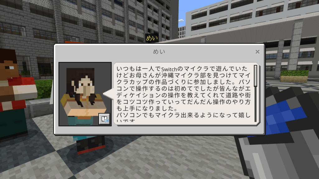 いつもは一人でSwitchのマイクラで遊んでいたけどお母さんが沖縄マイクラ部を見つけてマイクラカップの作品づくりに参加しました。パソコンで操作するのは初めてでしたが皆んながエディケイションの操作を教えてくれて道路や街をコツコツ作っていってだんだん操作のやり方も上手になりました。