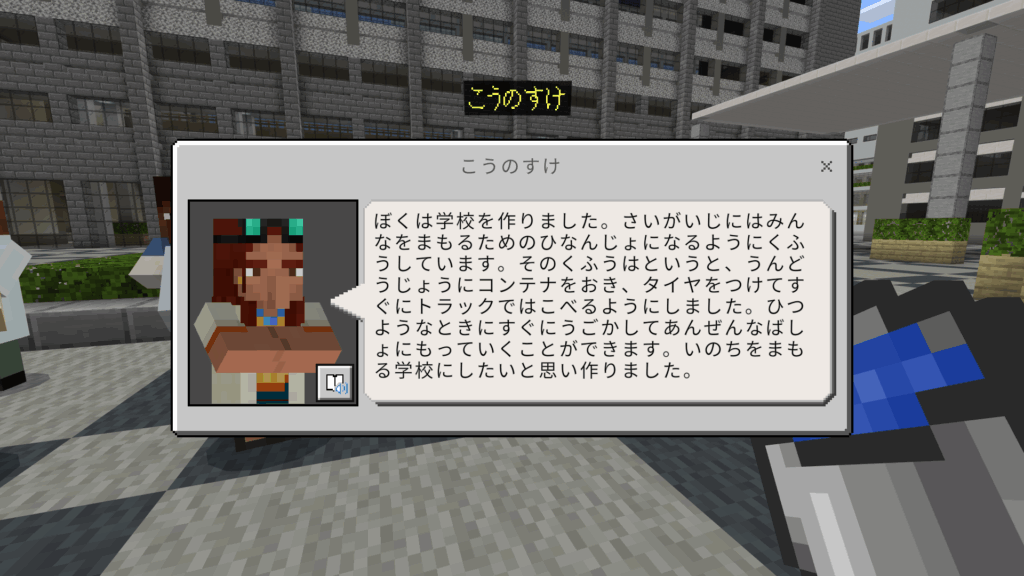 ぼくは学校を作りました。さいがいじにはみんなをまもるためのひなんじょになるようにくふうしています。そのくふうはというと、うんどうじょうにコンテナをおき、タイヤをつけてすぐにトラックではこべるようにしました。ひつようなときにすぐにうごかしてあんぜんなばしょにもっていくことができます。いのちをまもる学校にしたいと思い作りました。