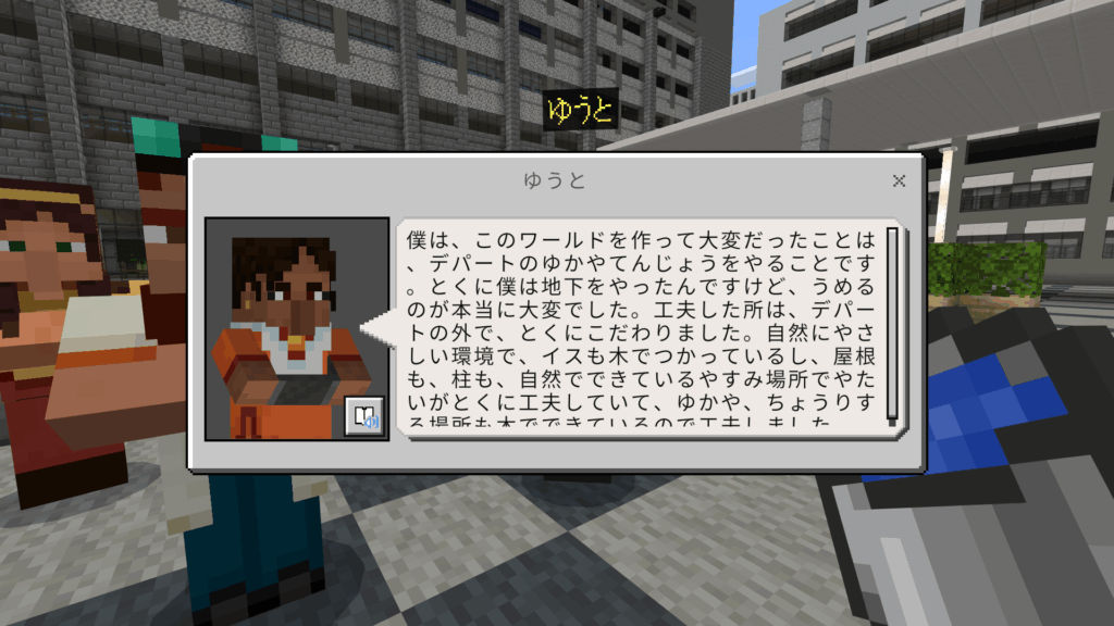 僕は、このワールドを作って大変だったことは、デパートのゆかやてんじょうをやることです。とくに僕は地下をやったんですけど、うめるのが本当に大変でした。工夫した所は、デパートの外で、とくにこだわりました。自然にやさしい環境で、イスも木でつかっているし、屋根も、柱も、自然でできているやすみ場所でやたいがとくに工夫していて、ゆかや、ちょうりする場所も木でできているので工夫しました。